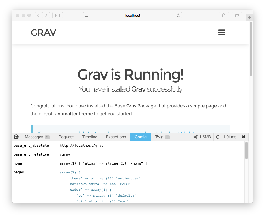 The first tab is for Messages and you can use this to help debug your Grav development process by posting information to this tab from your code.
