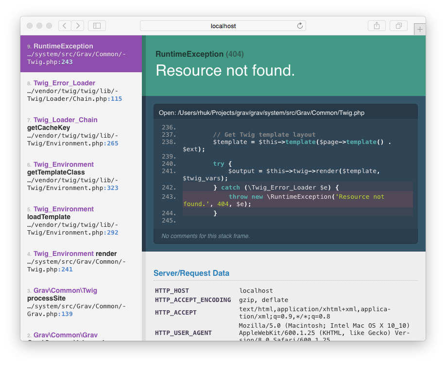 Our new error display page provides detailed information, backtraces, and even relevant code blocks. This helps to more quickly isolate, identify and resolve critical errors. By default in Grav, these are turned off by default, so you will need to enable them to take advantage of this helpful error handling for development: