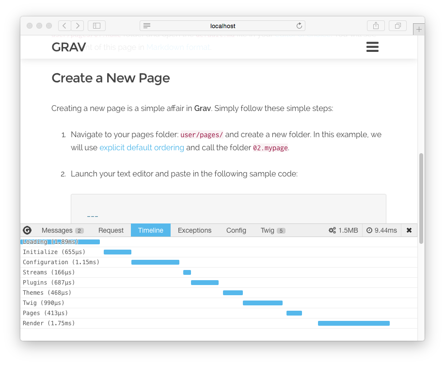 Along with Request, Exceptions, and Configuration information, you can also see a detailed breakdown of Grav timing in the Timeline panel: