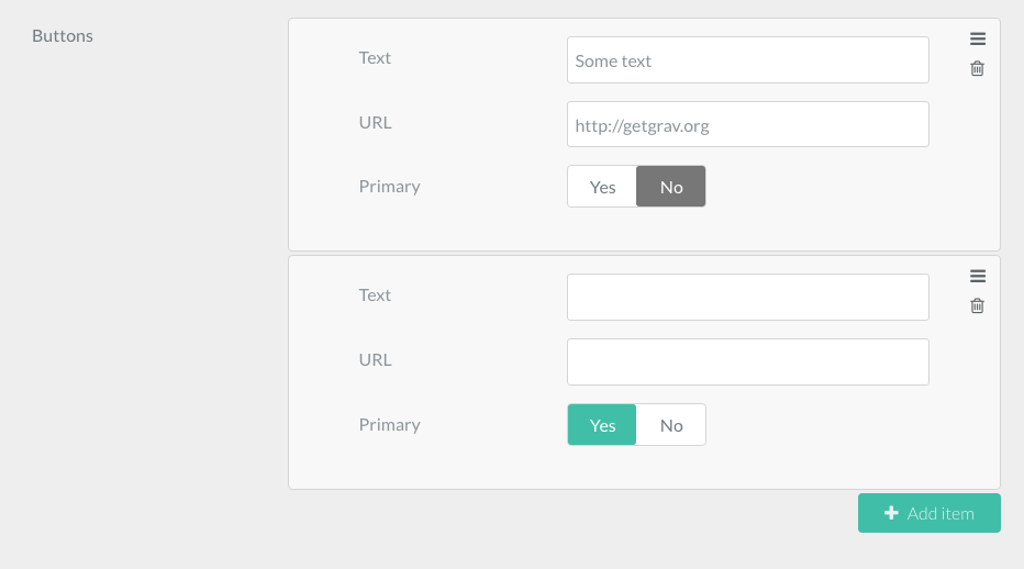 [codesh=yaml line-numbers="true"]header.buttons: name: buttons type: list style: vertical label: Buttons fields: .text: type: text label: Text .url: type: text label: URL .primary: type: toggle label: Primary highlight: 1 default: 1 options: 1: 'Yes' 0: 'No' validate: type: bool