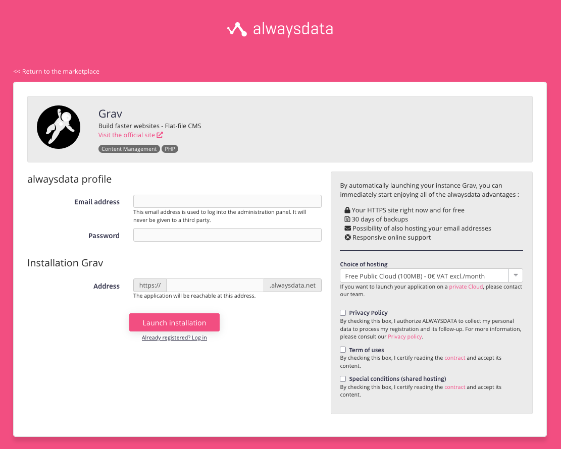 A public Marketplace provides a lot of applications, including Grav. By providing very few information, your instance will be instantly available (HTTPS), on the free plan, with included backups.