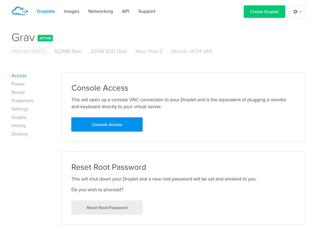 The Access tab in the Droplet Manager allows you to quickly log on to your instance, but using SSH is a more enjoyable experience. Public key authentication is also recommended, and DigitalOcean has great SSH public key authentication documentation that walks you through the steps required.