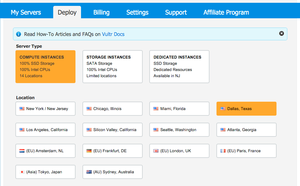 After creating an account and navigating to the Vultr Control Manager, click on the Deploy tab. Leave the server type on Compute Instances and choose a location:
