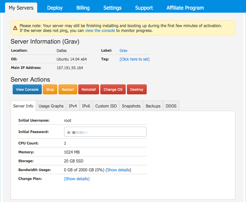 After a minute or so, your server should be ready and you can click the manage link next to your server in the list to get the server details. On this page you will be shown a control panel for the server that lets you control the state, along with the initial root username and password. You can can SSH via the command provided in this tab using the password you entered when you created the distribution instance. Public key authentication is recommended, and Vultur has SSH public key authentication documentation that walks you through the steps required.