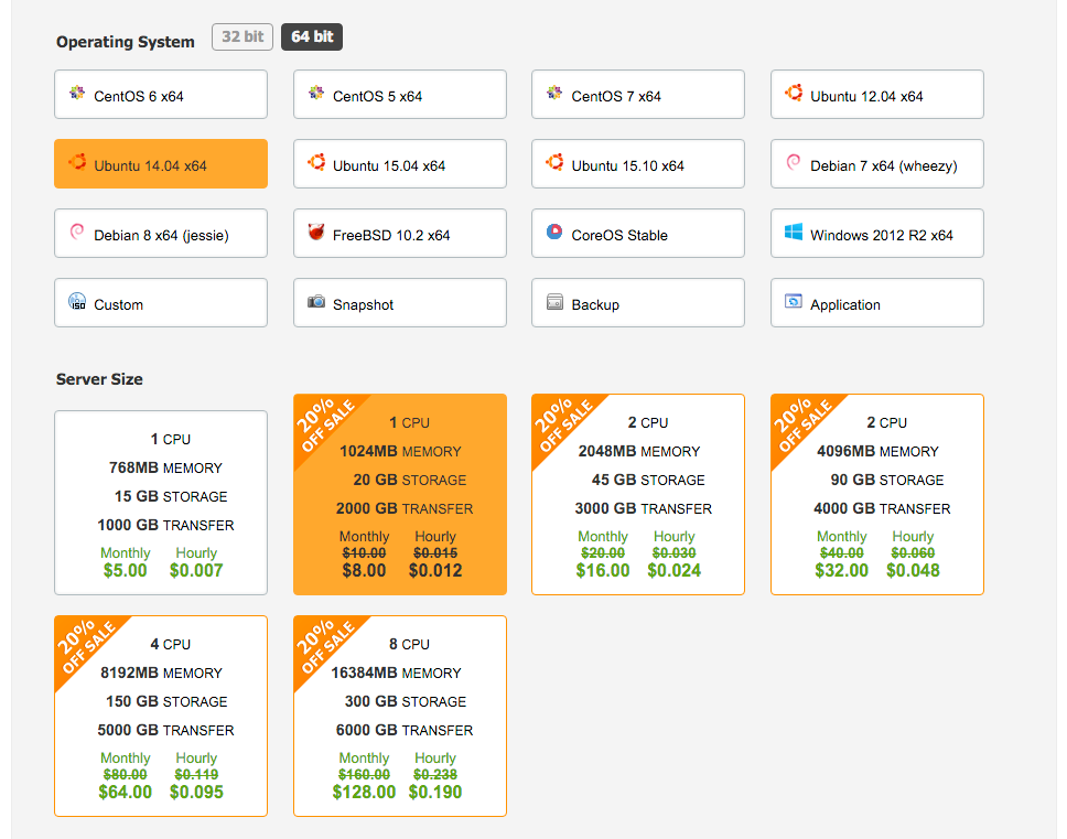 For the Server Size you can pick a size that is appropriate for you but Grav will run great on any of them. For the sake of this guide, we'll use the 1 CPU, 1GB memory option that is currently priced at $8/month.